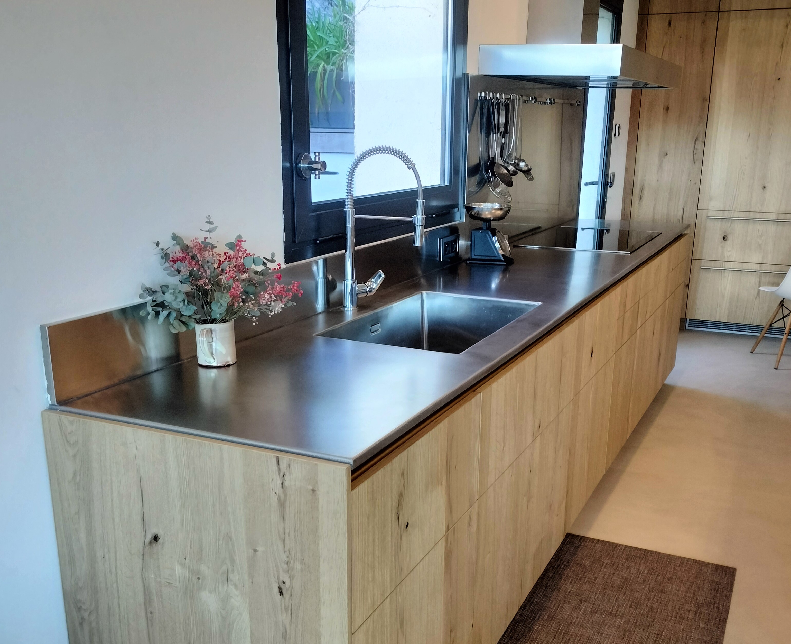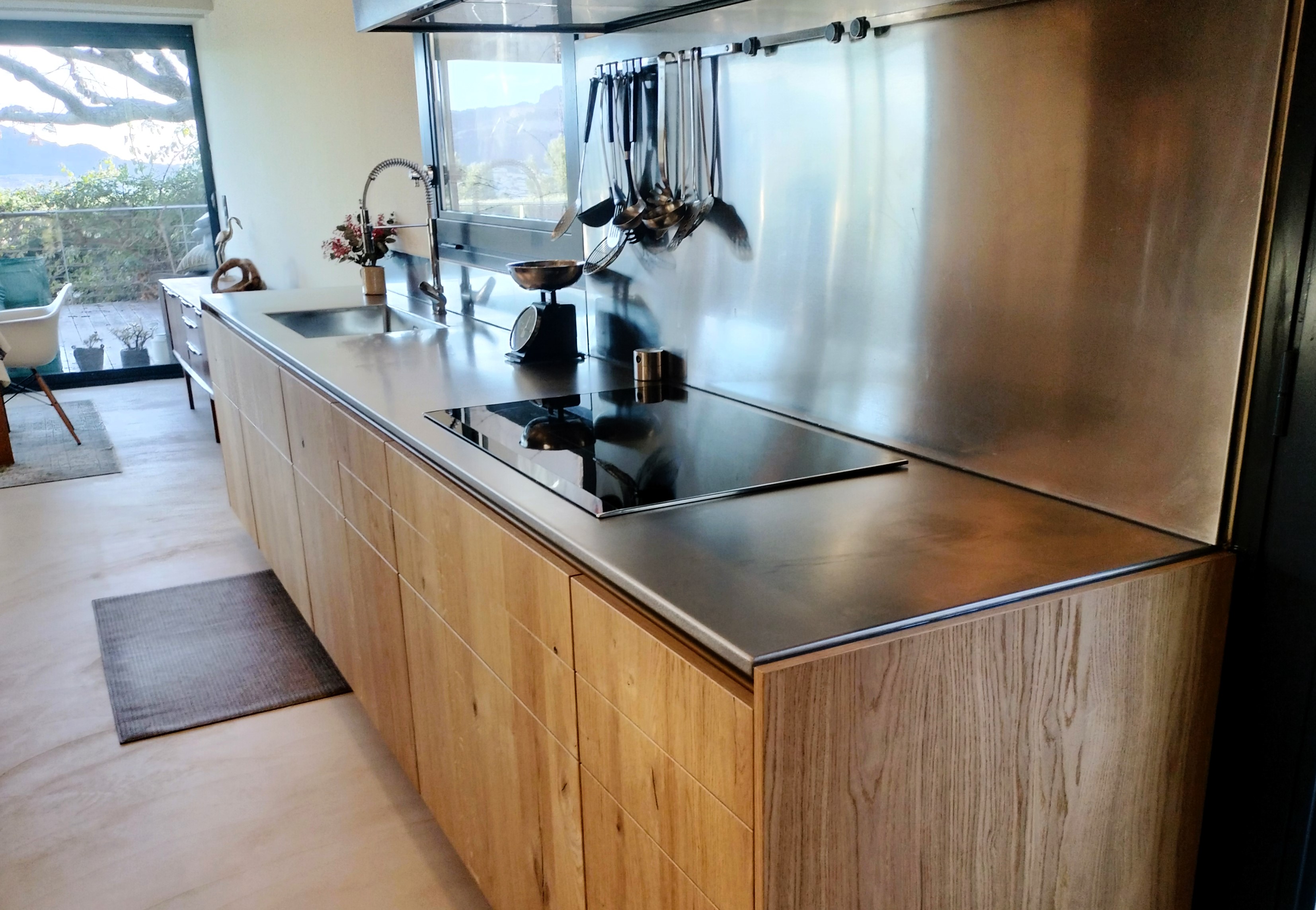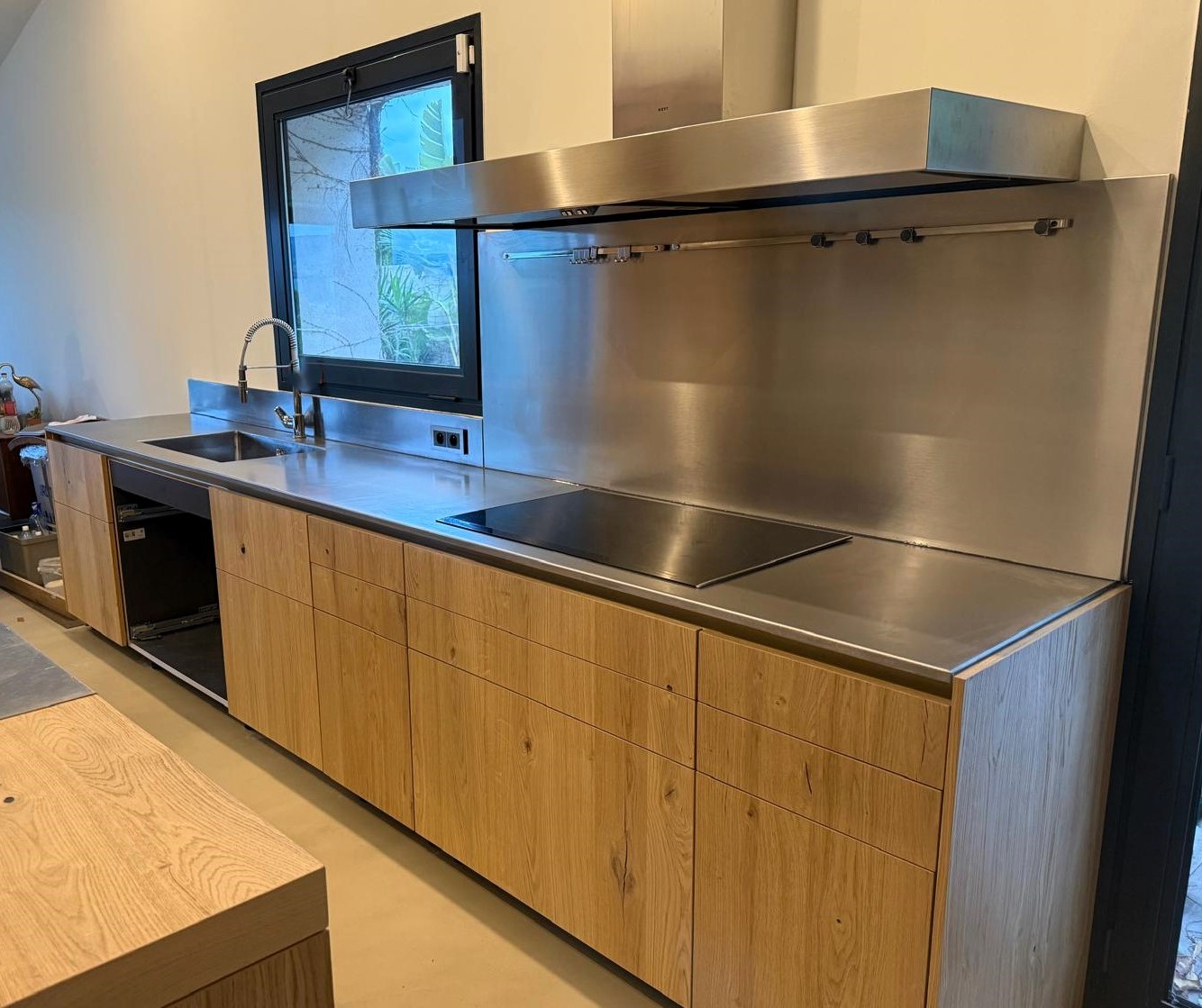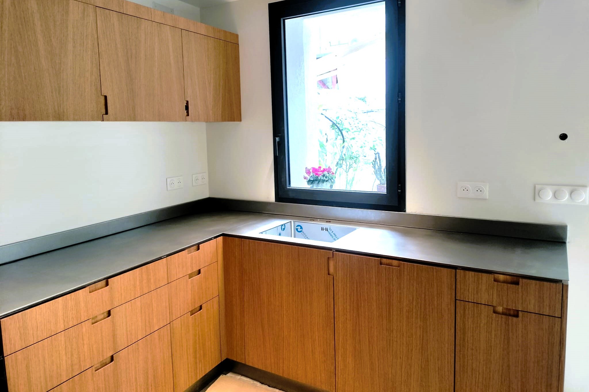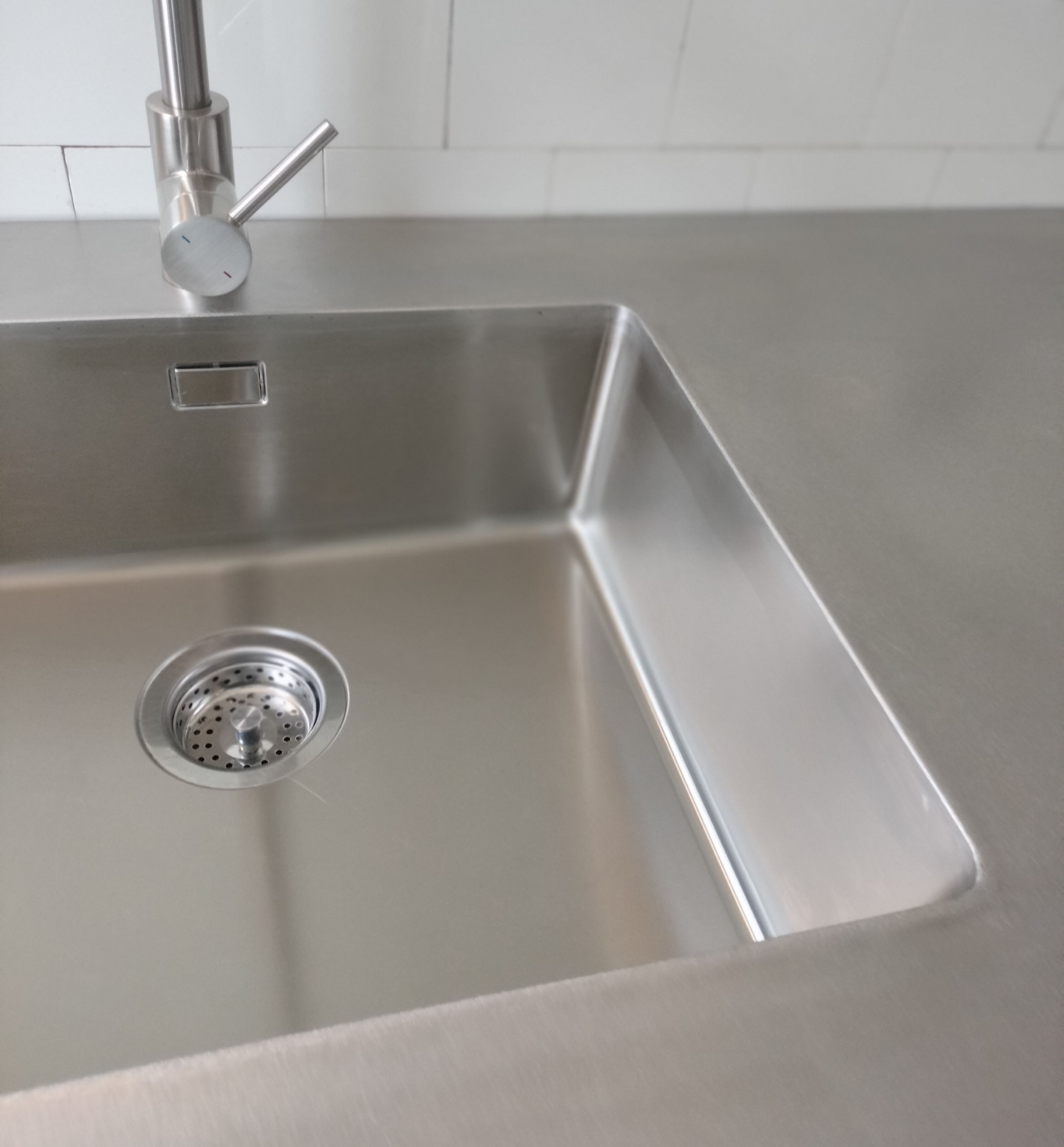 Nous avons réalisé ce plan de travail sur mesure en inox vibré dans la cadre de la rénovation d’une cuisine à Marseille. Ce plan de travail d’une seule pièce est constitué d’une tôle en inox d’épaisseur 5mm avec un retour crédence. Il est collé sur un support en bois.