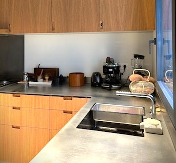 L’alliance des deux matériaux est très réussie. La cuisine rénovée est très contemporaine et tout à fait dans l’air du temps.