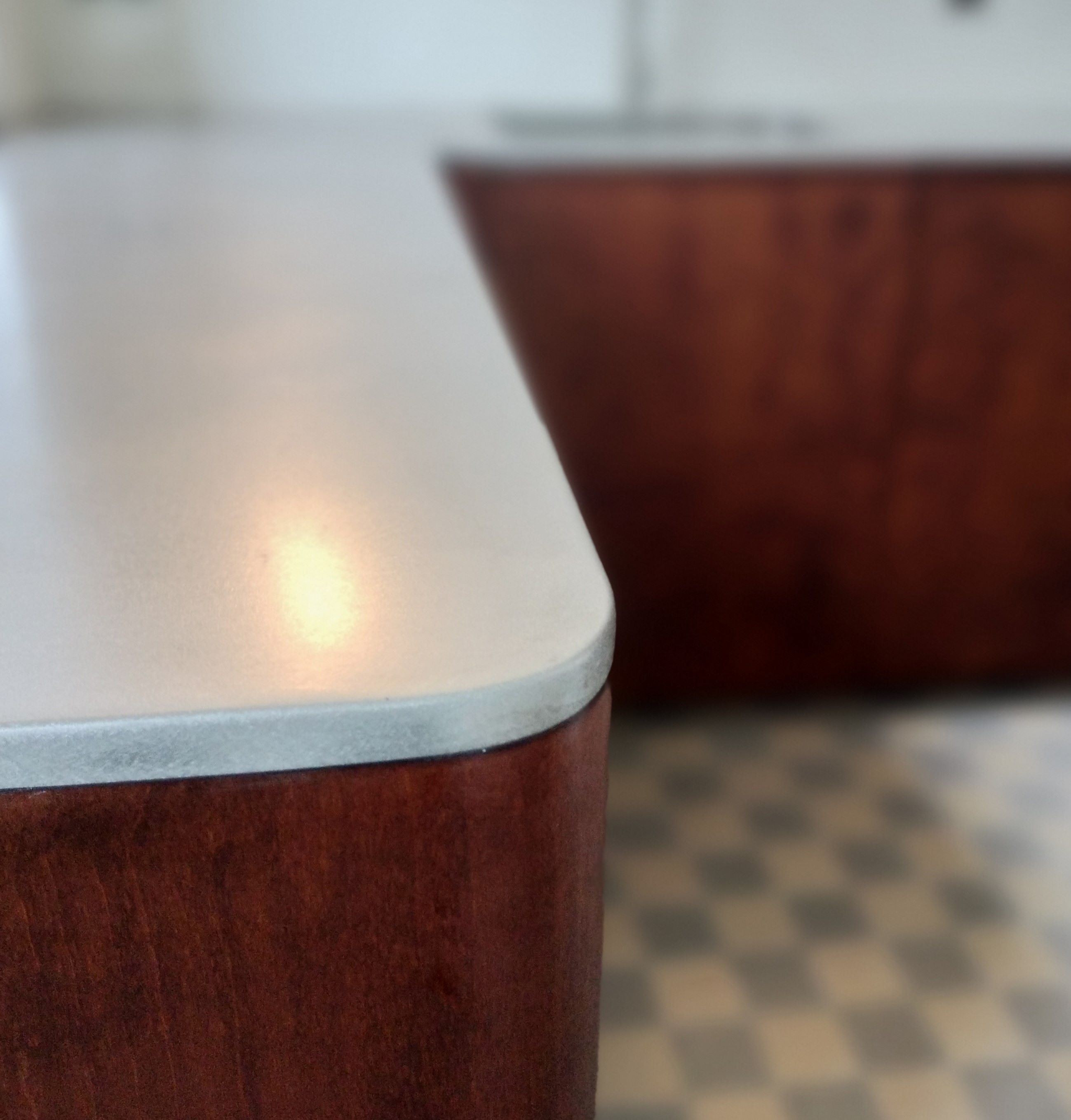 Nous avons réalisé ce plan de travail sur mesure en inox vibré dans la cadre de la rénovation d’une cuisine à Marseille. Ce plan de travail en angle d’une seule pièce est constitué d’une tôle en inox pliée d’épaisseur 1,5mm. Il est collé sur un support en bois. Il a un bord arrondi. Nous avons soudé le bac inox.