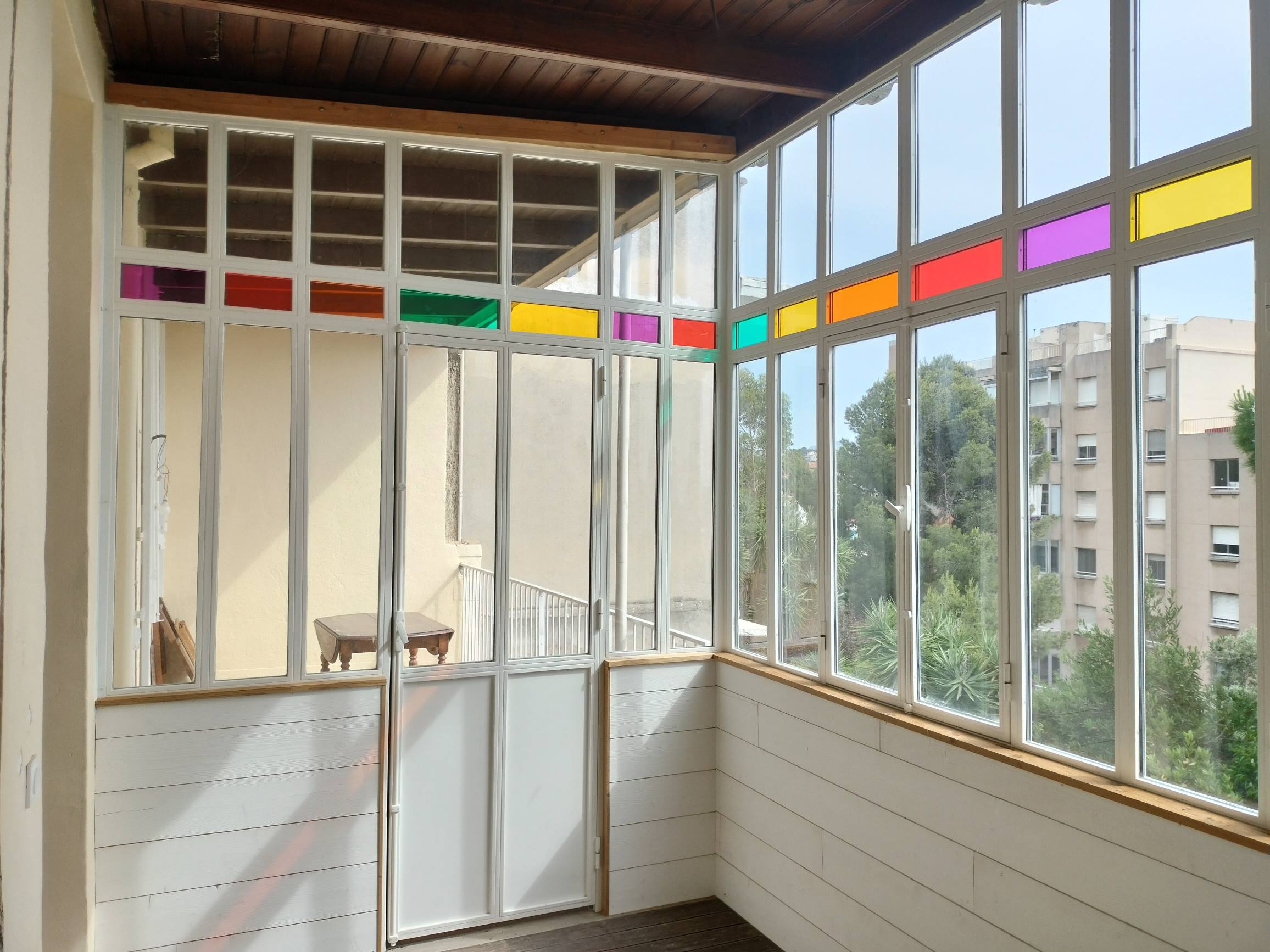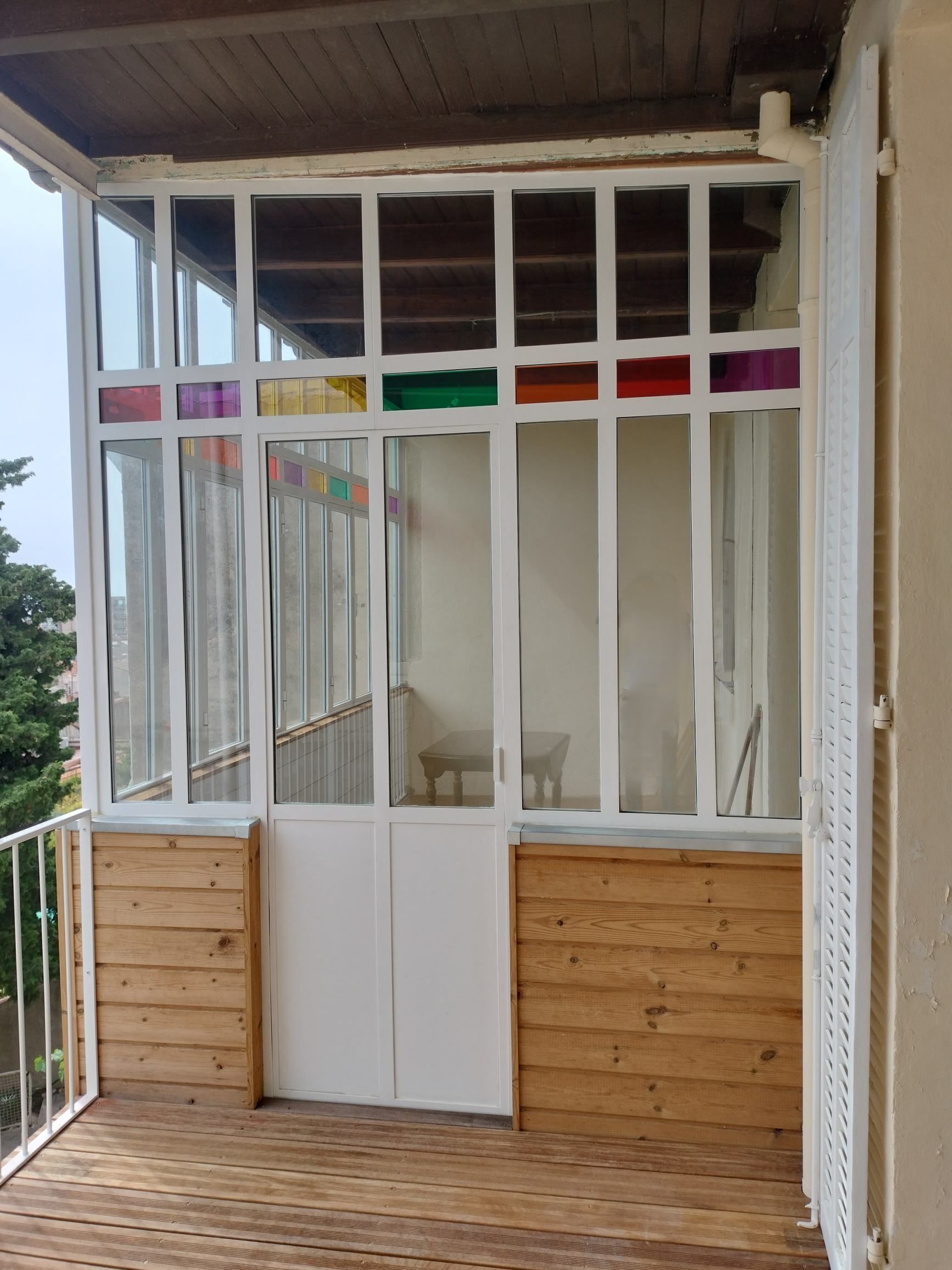 Cette verrière a été mise en place afin de fermer une partie d’un balcon d’un appartement marseillais. Afin de reproduire un style ancien, elle est en acier thermolaqué avec du verre clair et du verre coloré.