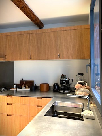 L’alliance des deux matériaux est très réussie. La cuisine rénovée est très contemporaine et tout à fait dans l’air du temps.