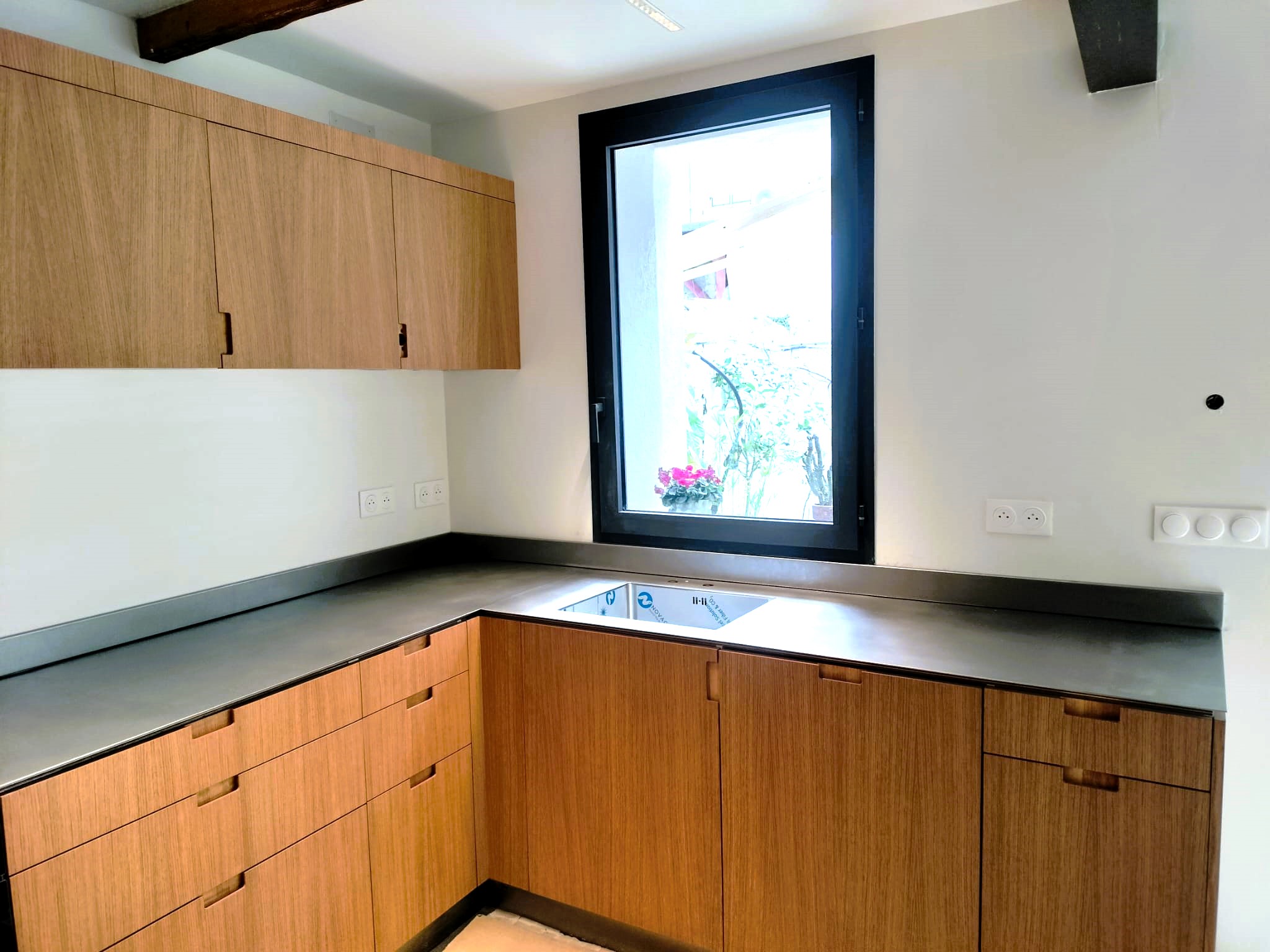 Nous avons réalisé ce plan de travail sur mesure en inox vibré dans la cadre de la rénovation d’une cuisine à Marseille. Ce plan de travail d’une seule pièce est constitué d’une tôle en inox d’épaisseur 5mm avec un retour crédence. Il est collé sur un support en bois.