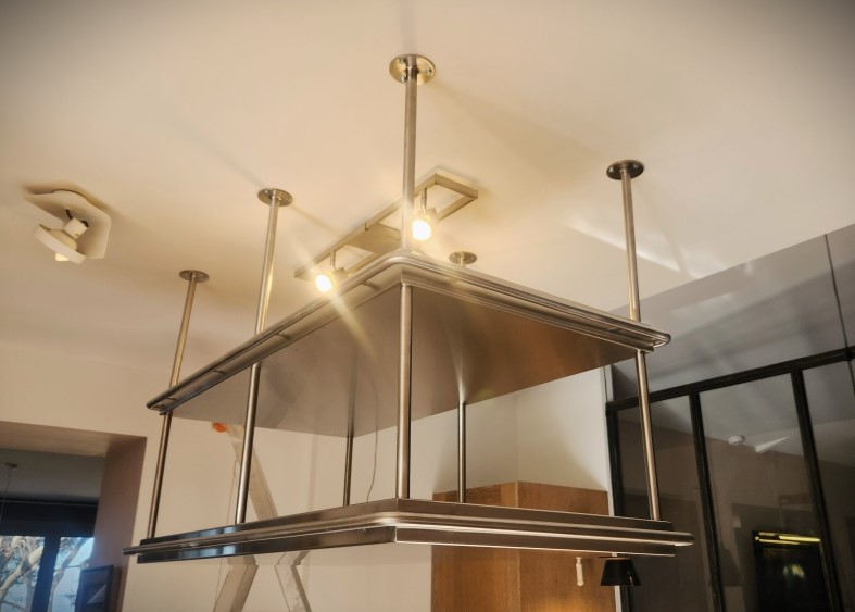 Ces 2 étagères en double peau sont en inox brossé, fixées au plafond au-dessus d’un îlot central de cuisine.